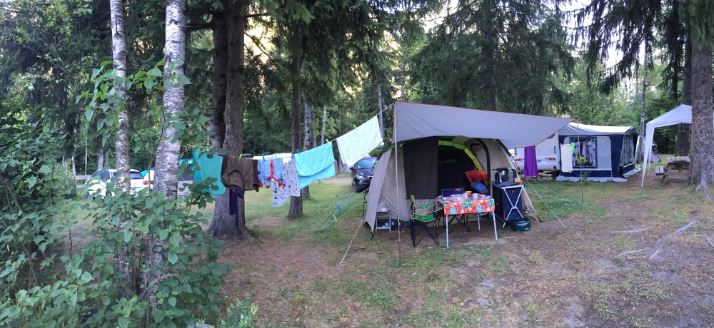 Bij aankomst op de camping begonnen we meteen onze heuse familietent op te stellen, maar dat was wel een uitdaging want Ulrike deed het meeste alleen terwijl ik Alice eten gaf, ververste en bezig hield. Maar al duurde het langer dan zonder baby, toch lukte het ons om alle spullen een plekje te geven. Alice keek vanop een picknickdeken naar de blaadjes van de bomen en keurde het goed.