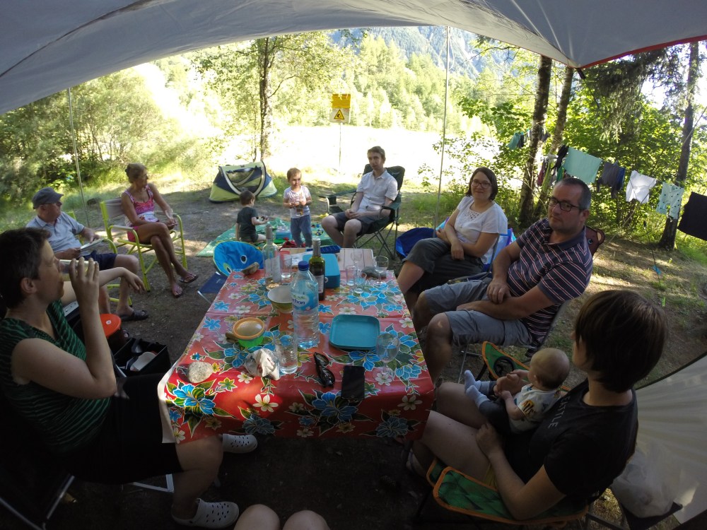 Kamperen met een baby ging eigenlijk heel vlot: onze dagen verliepen min of meer zoals thuis, behalve dan dat we in de buitenlucht leefden en een echt vakantiegevoel hadden. Maar eerlijkheid gebiedt, we hadden elk onze handen wel vol: Ulrike zorgde meestal voor het eten, de afwas, het opruimen etc en ik hield me meestal bezig met de zorg voor Alice (borstvoeden, pampers, insmeren,…). Gelukkig bleef er nog voldoende tijd over om te aperitieven en te barbecueën met de sympathieke en hulpvaardige kampeerders naast ons. Echte camping-sfeer met andere woorden.