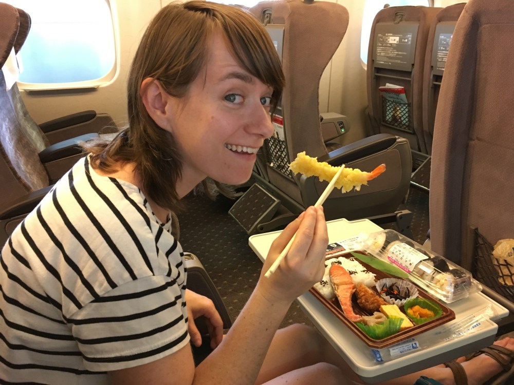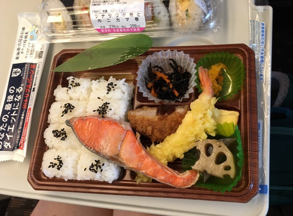 In een convenient store (Kombini in het Japans) kopen we twee bentoboxen. Dé ideale lunch voor op de trein.