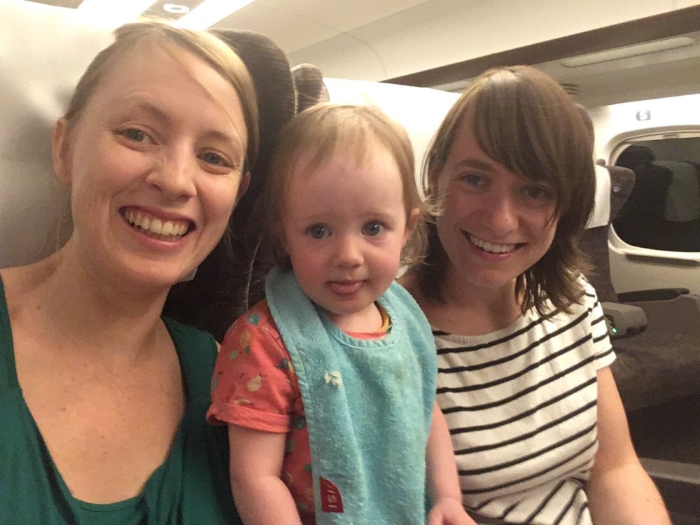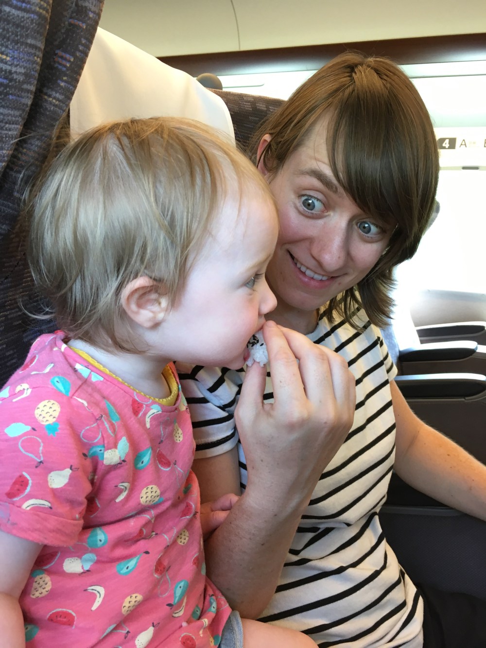 Ook de Shinkansen is erg comfortabel. Onze zetels zijn ruim. Alice past zelfs op de brede armleuning tussen ons in maar vindt het leuker om met de uitklapbare voetsteuntjes te spelen en daar op te gaan zitten.
