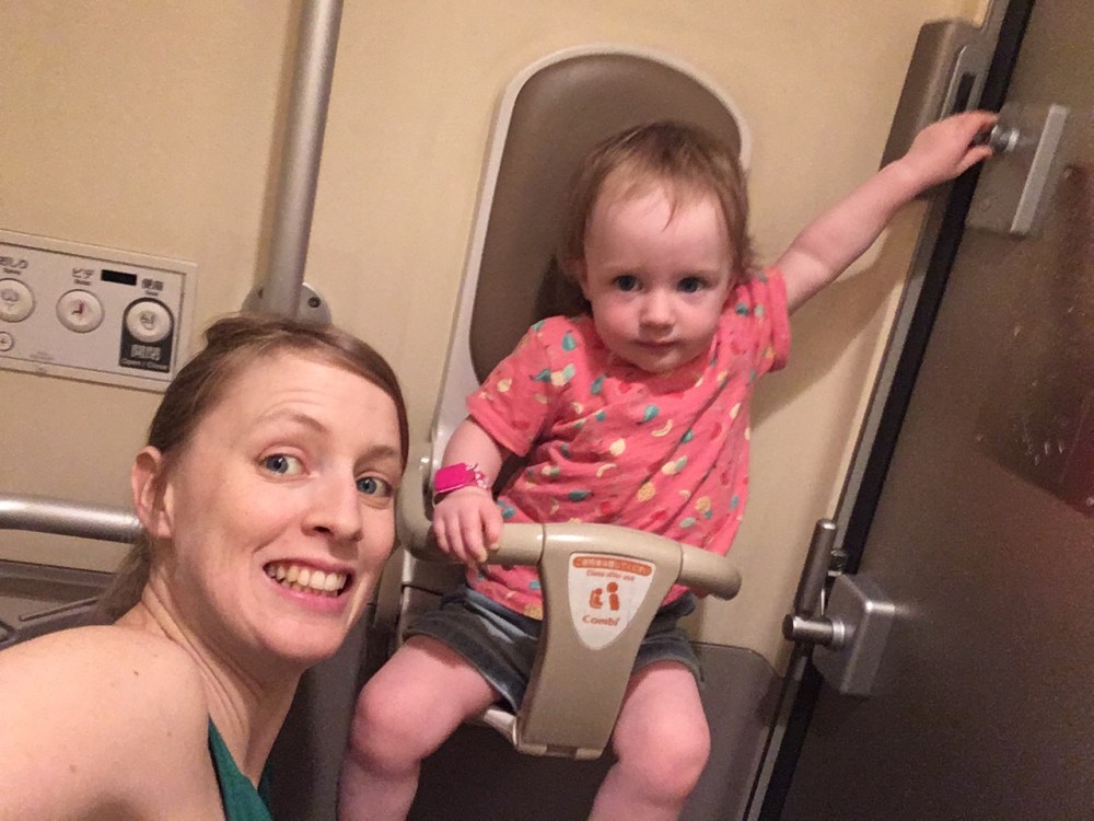 De Narita Airport Express trein verbaast ons al omwille van de comfortabele zetels (die je zowaar naar achter kan zetten), de duidelijke aankondigingsschermen, de supergrote en kraaknette wc met ververstafel en kinderhangstoeltje en het ultrastipte vertrek. Dit is comfortabel reizen!