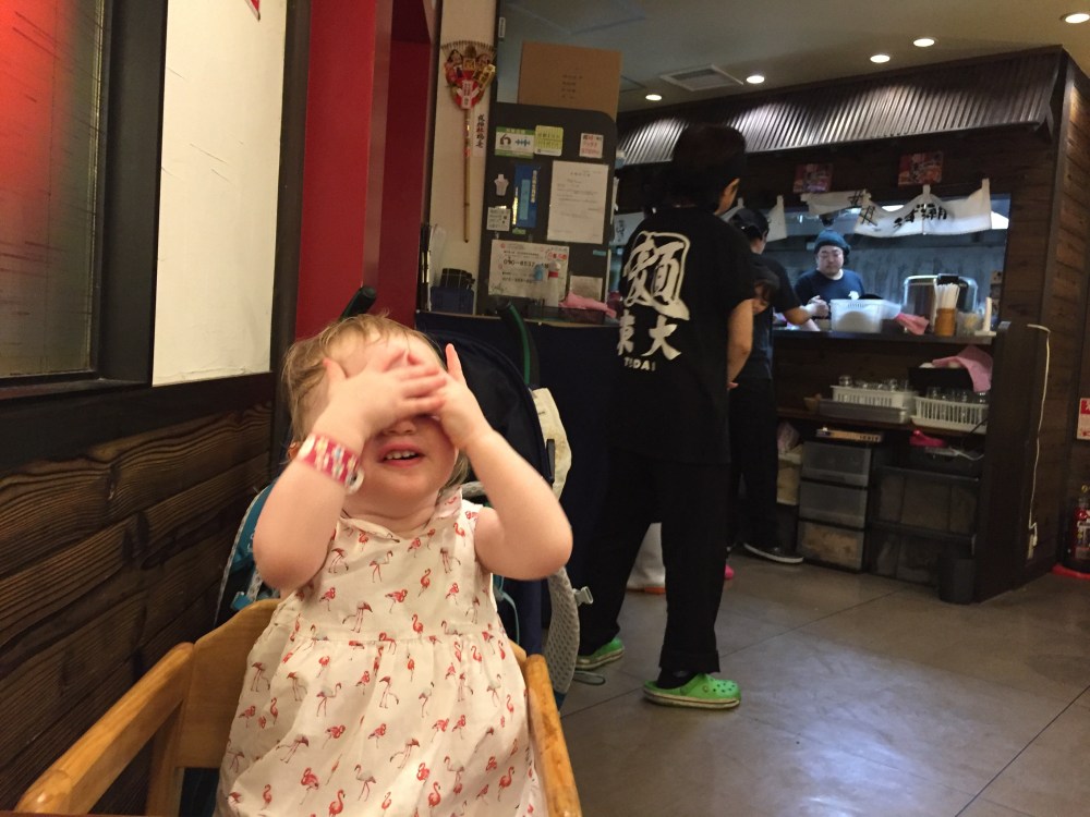 Zoals altijd als er teveel aanbod is en we honger hebben, zijn we besluiteloos. Alice heeft ook honger en begint te jengelen. Uiteindelijk nemen we de liften in het stationsgebouw naar de 10e verdieping: een hele verdieping vol ramen-bars. Op goed geluk kiezen we 1 van de restaurants uit. Het bestellen moet via een automaat aan de ingang. Alles staat in het japans dus kiezen we maar random op basis van de foto’s twee gerechten uit en steken ons geld in de automaat. De ticketjes geven we af aan de ober en dan nemen we plaats aan het tafeltje waar ze een kinderstoel hebben bijgeschoven.