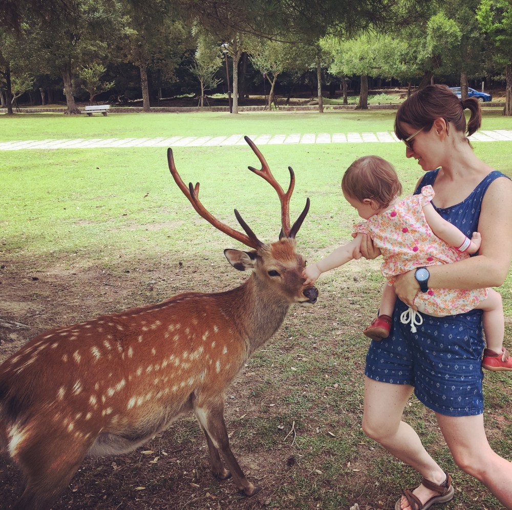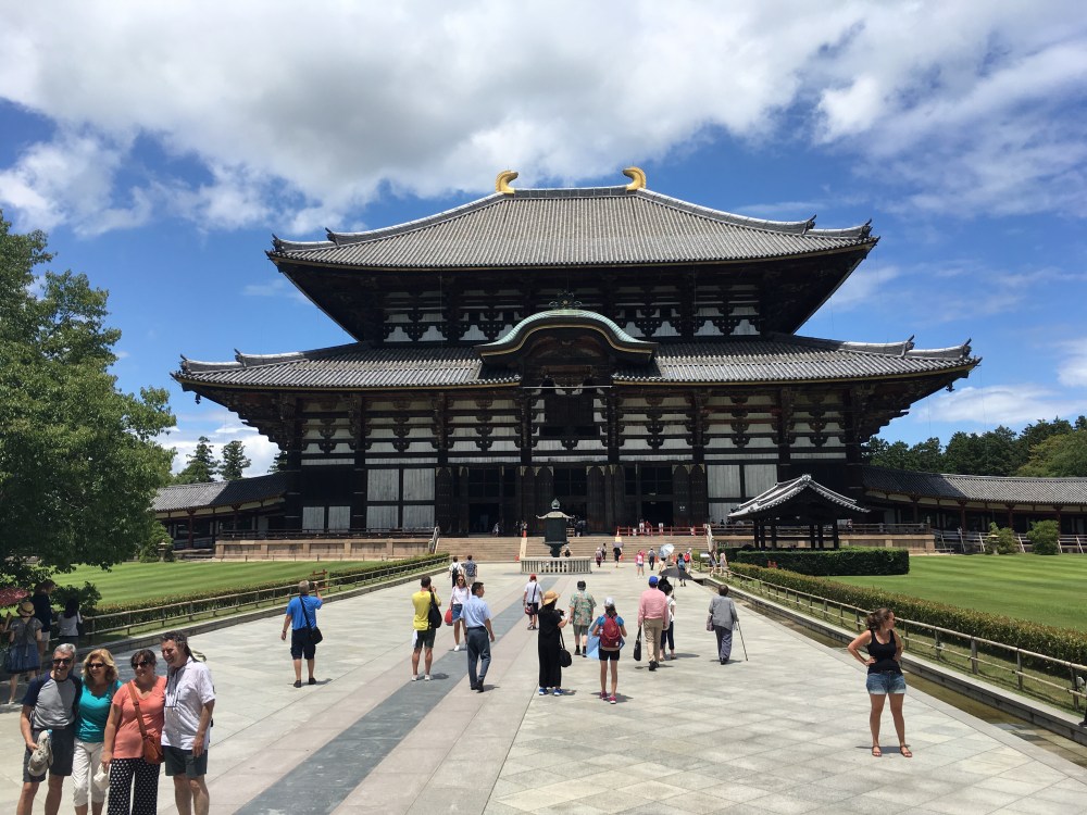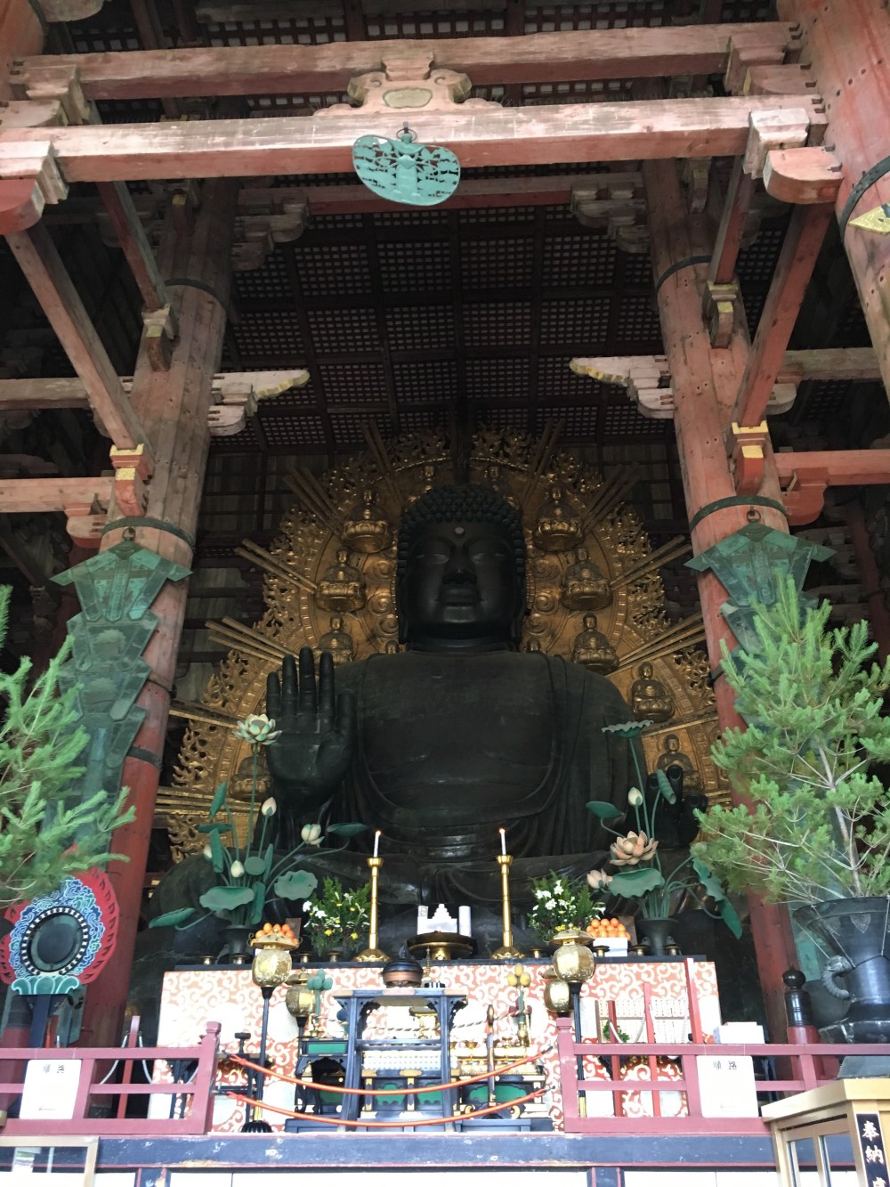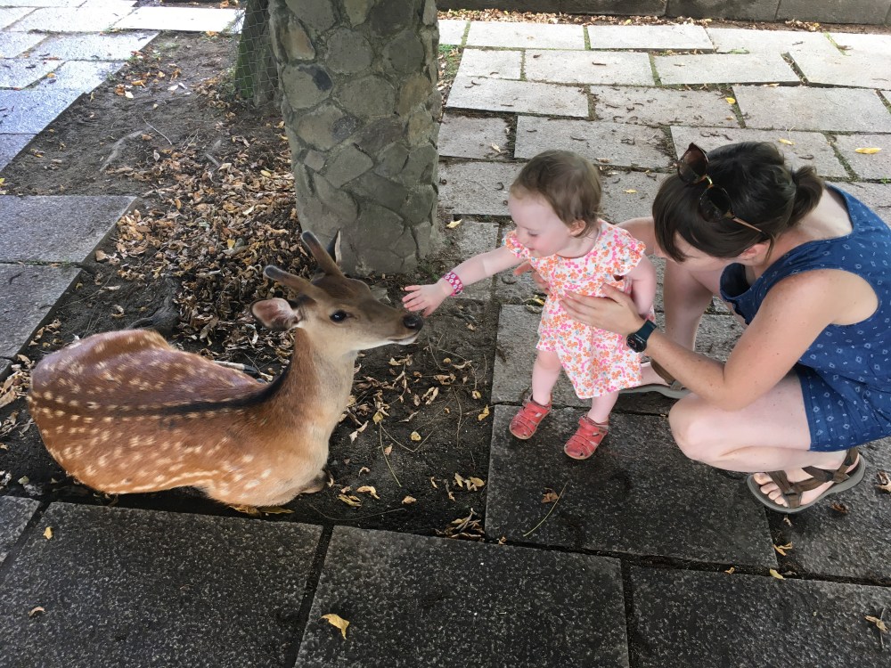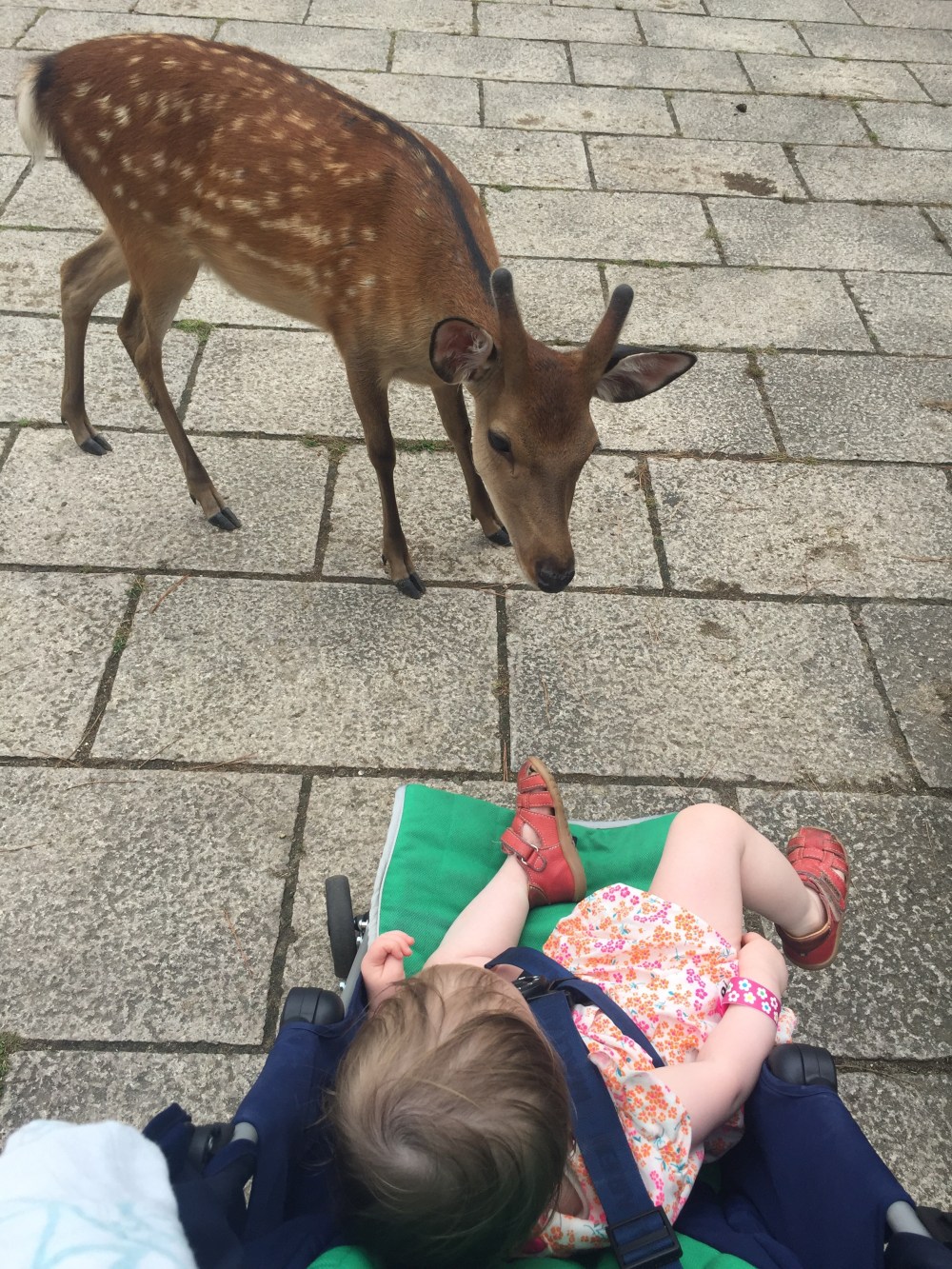 We komen uit op de Todaiji tempel maar wachten nog even in de schaduw op een bankje omdat Alice slaapt. Na een tijdje besluiten we om ze toch over te hevelen in de draagzak om de tempel te bezoeken (achteraf gezien niet nodig want de tempel heeft een toegang voor mindervaliden zonder trappen, maar dat wisten we niet).