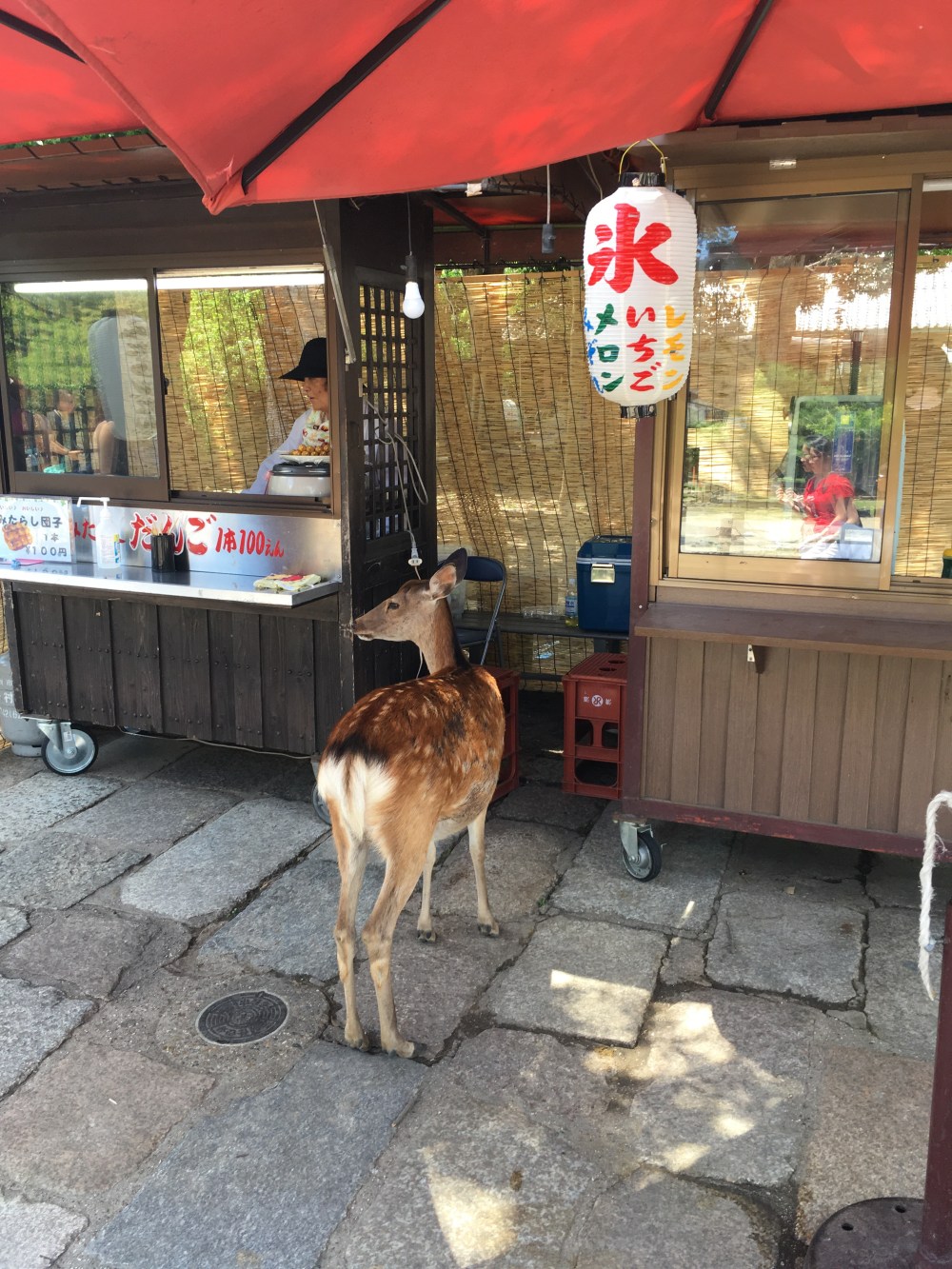 We kopen een portie hertenkoekjes aan één van de vele kraampjes en worden meteen opgemerkt door een groep herten. Ze happen de koeken uit de hand en happen zelfs in de poep. De zak met sushi moeten we goed beschermen want die hebben ze ook bijna mee. We worden als het ware achtervolgd door de ietwat aggressieve herten.