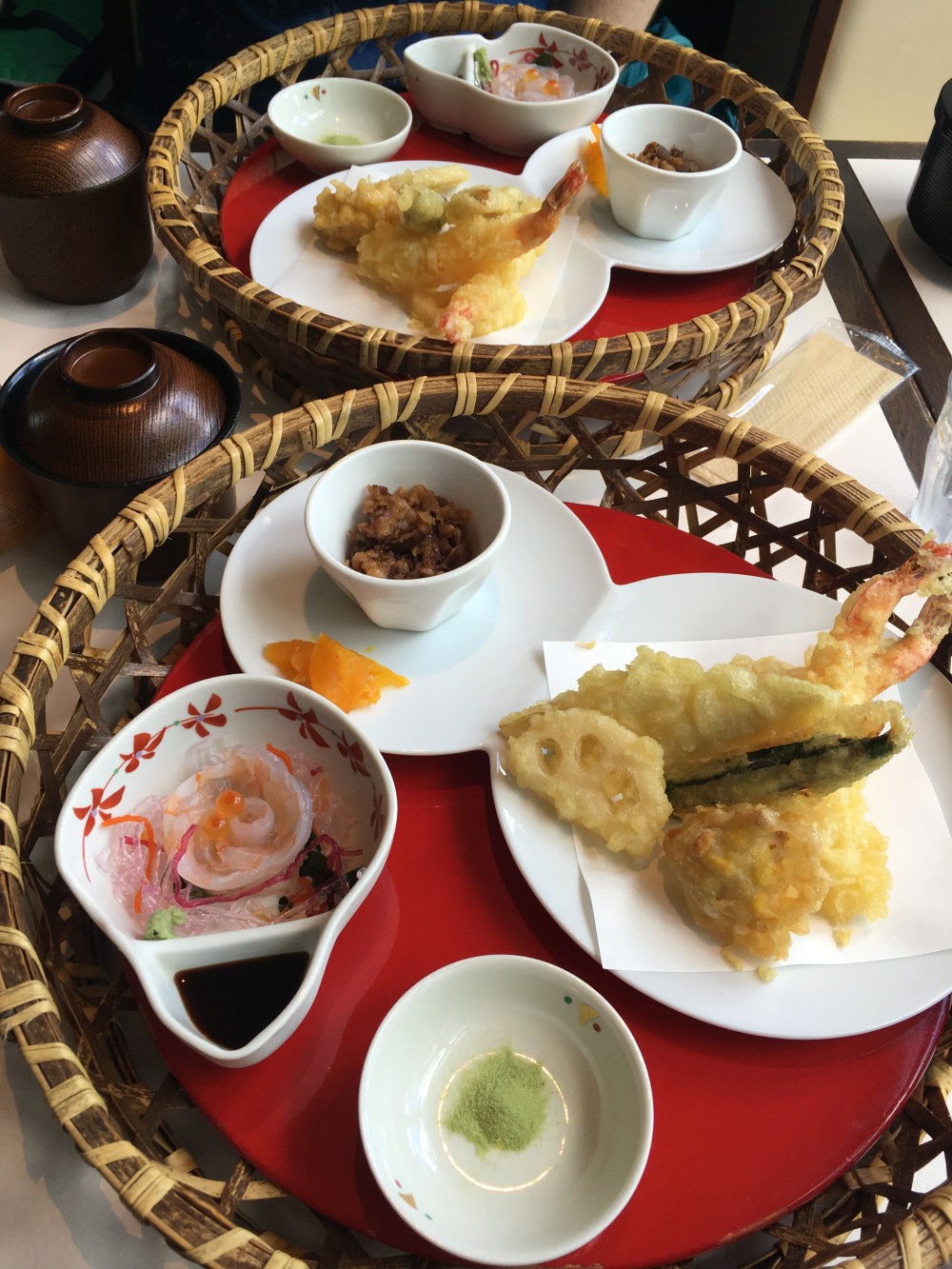 We stappen zonder treuzelen het eerste beste restaurant binnen want het is buiten veel te warm om te lang te aarzelen. In de koelte van het restaurant bestellen we een lunch set met alweer heel lekkere dingen zoals tempura, gemarineerd vlees, sashimi van reuzegarnaal, rijst en misosoep.