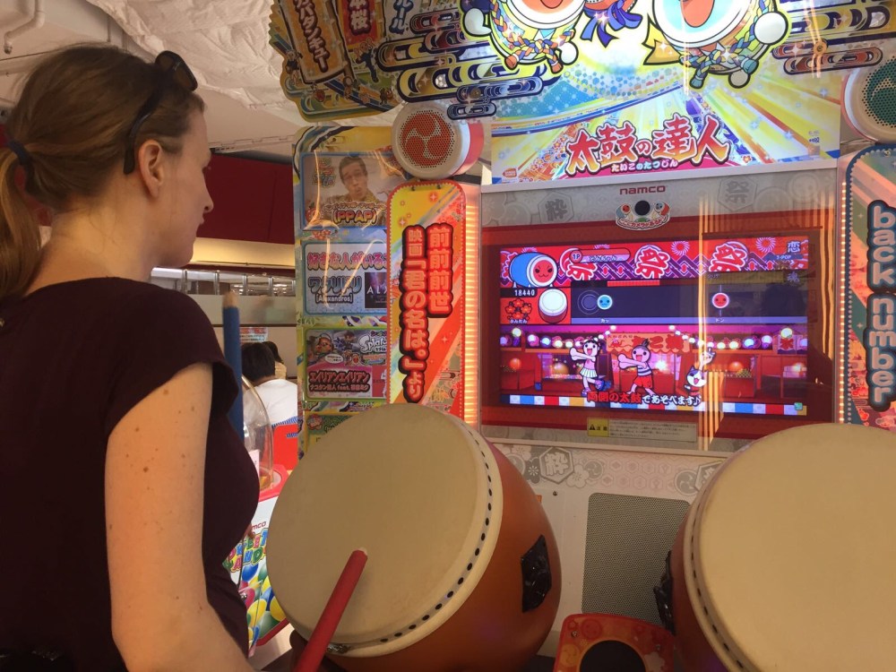 Vervolgens gaan we opnieuw naar de gigantische megastore Yodabashi Camera en kopen we een leuke pop voor Alice en avondeten voor thuis. We proberen er even een spel uit waarbij je op ritme op een trommel moet slaan: lachen geblazen want we verstaan absoluut niets van de keuzemenu en doen dus maar wat.