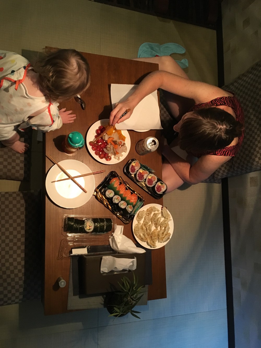 Thuis aangekomen hebben we echt wel nood aan verfrissing. We nemen een douche en doen Alice in bad en dan genieten we van lekkere sushi en gyoza.