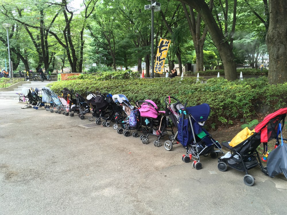 We begeven ons naar het Shinjuku Chuo Park vlakbij het gebouw. In dit park is namelijk een buitenplonsbad voor de allerkleinsten. Alice slaapt ondertussen dus drinken we eerst een ijskoffie aan een klein café vlakbij het plonsbad. Het bad opent maar om 11 uur maar er staat al een hele hoop wachtende Japanse families netjes in een rij aan te schuiven. De rij geparkeerde buggy’s is ook impressionant.