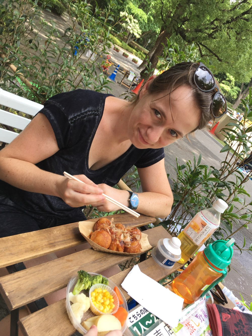 Wij maken echter van de gelegenheid gebruik om het hier bij te laten en kleden Alice weer om. We eten een snack aan het café: een zakje vers gesneden, gekookte groentjes en aardappelen dat we gisteren voor Alice hebben gekocht, en voor ons een portie Takoyaki: een soort van zoute oliebollen met een octopusje middenin. Ideaal als snack in afwachtig van een middagmaal!