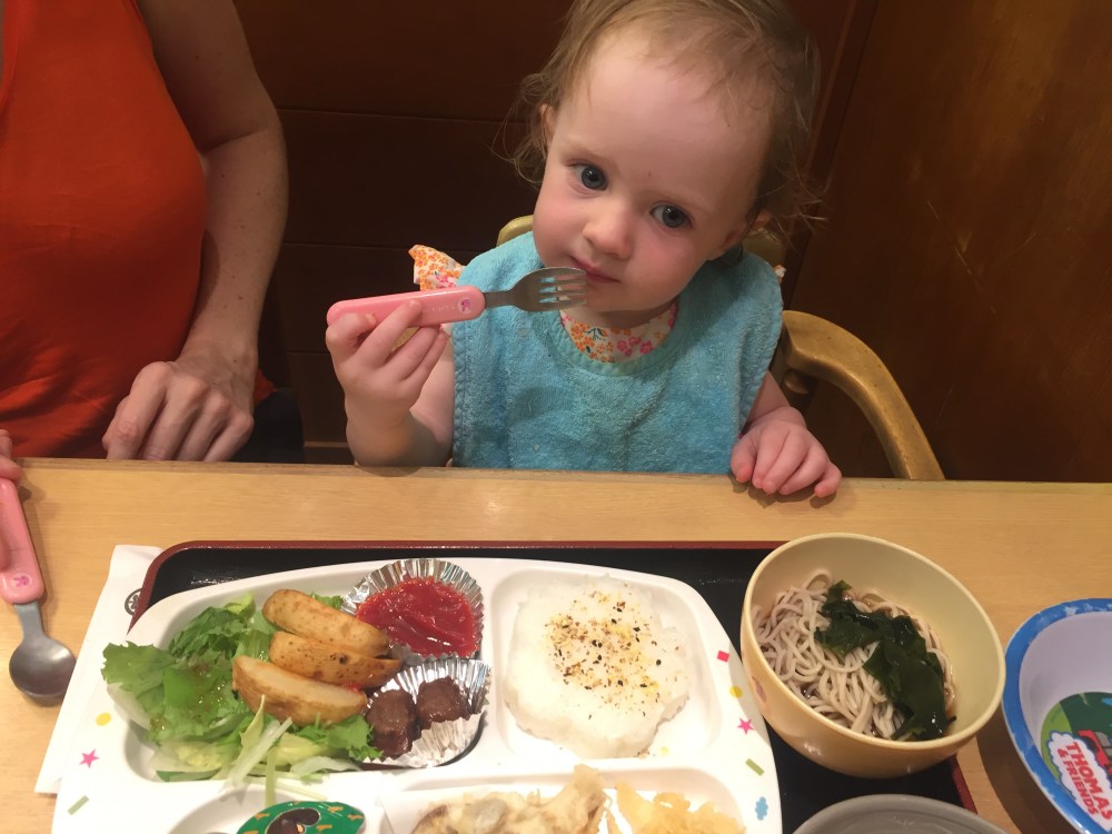 Wij genieten van een set menu met soba noedels en tempura en voor Alice bestellen we -voor het eerst- een volledig kindermenu. We staan ervan versteld dat ze haar plateau bijna volledig leegeet: groententempura, noedels, rijst, aardappelen,… het gaat allemaal vlot binnen. En als bonus mag ze van de ober een cadeautje uit een mand uitkiezen! Geslaagde maaltijd voor iedereen dus.