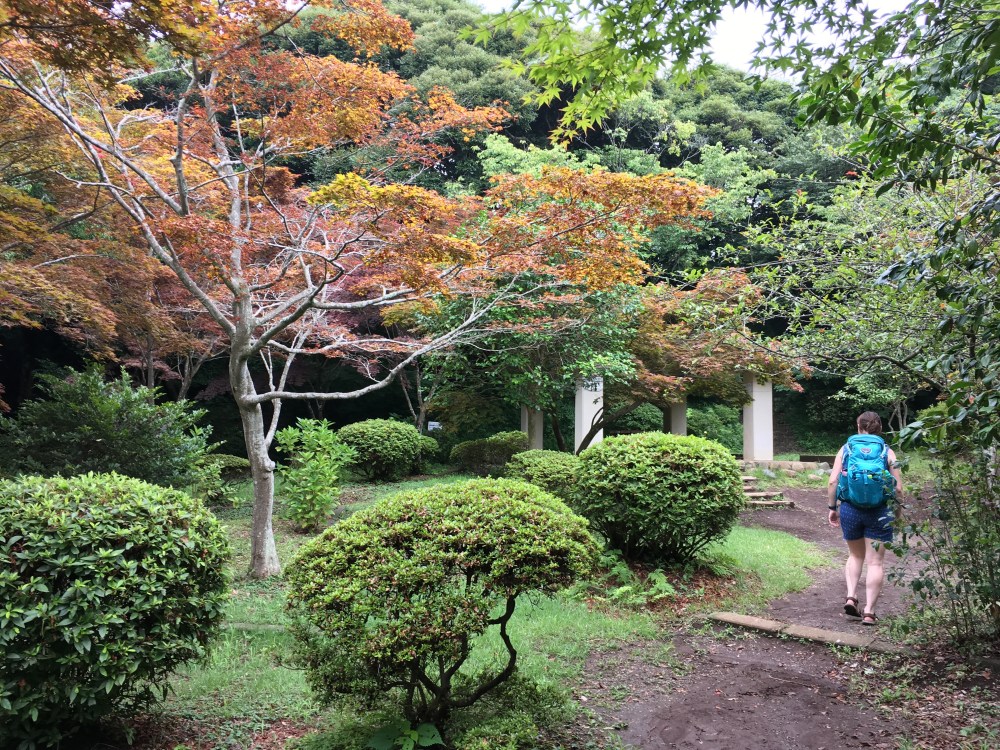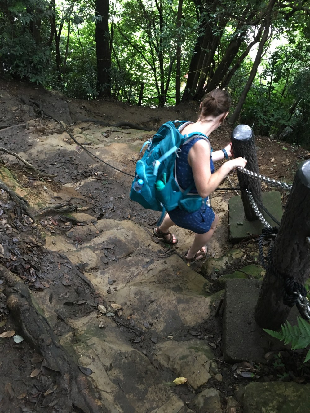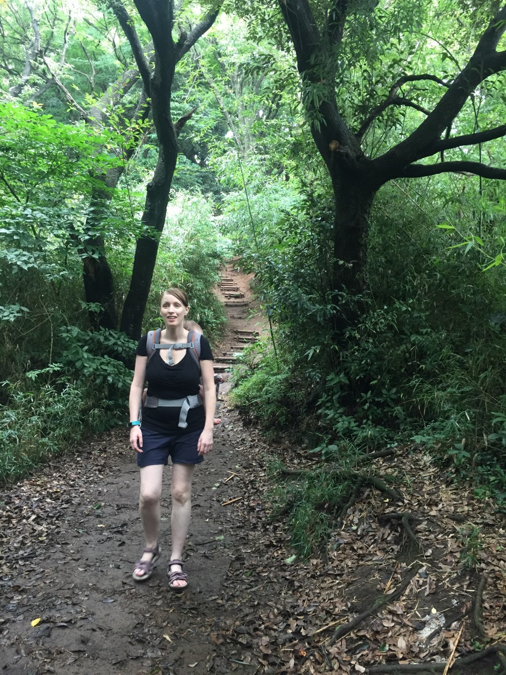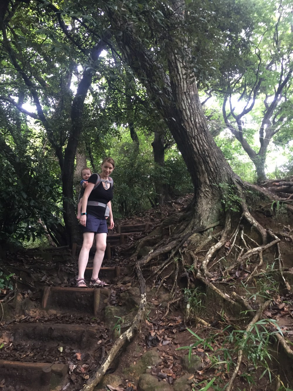 We wandelen verder, nu vooral bergaf, tot we de een baan bereiken die naar de Kotoku-in tempel leidt. Het laatste stukje op het pad is even wat steiler, maar niets dat we niet gewoon zijn en bovendien zijn er touwen en kabels om je aan vast te houden. Al bij al geen moeilijke hike dus, zelfs niet met een baby van 10kg op je rug en eentje in de buik.