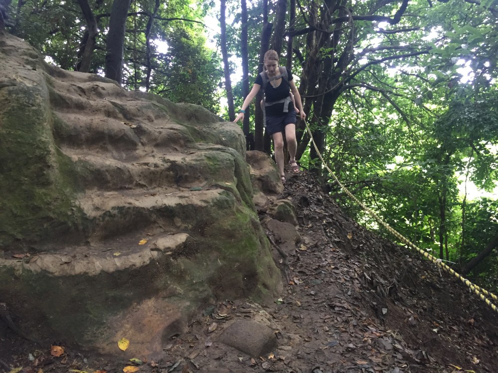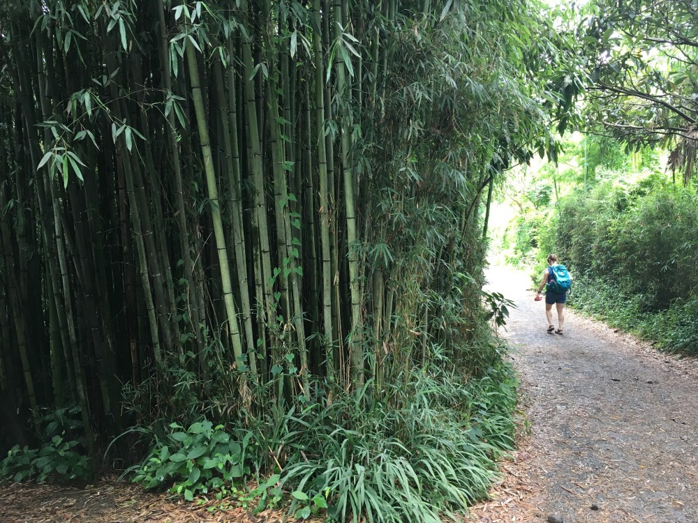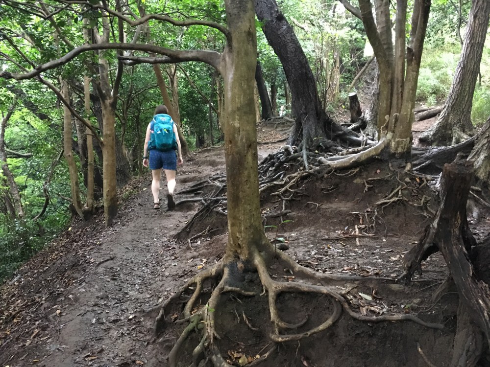 Het pad leidt ons al gauw door een mooi bos met heel wat boomwortels. We vreesden dat het erg druk ging zijn zo op een zondag maar we zijn helemaal alleen, op enkele tegenliggers en het tropische geluid van de vogels en krekels na.