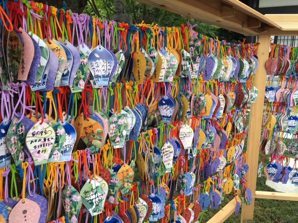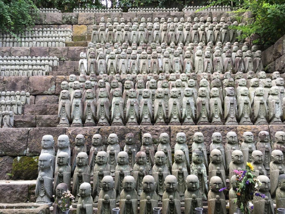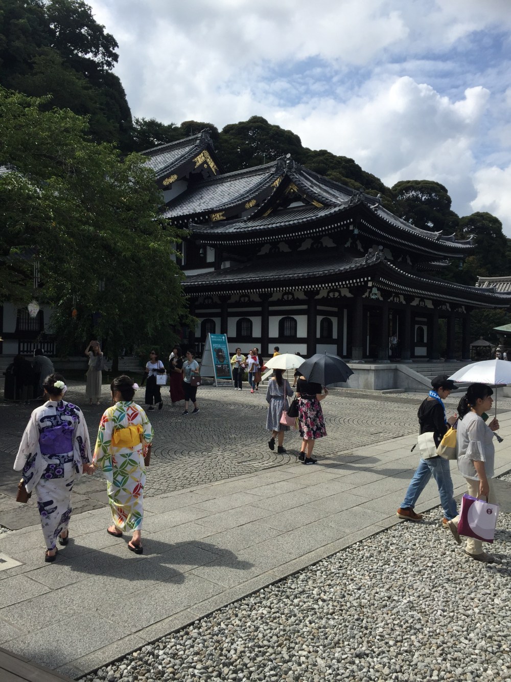 Vlakbij het restaurant bezoeken we nog de Hasedera tempel: een complex van tempels en schrijnen, prachtige tuintjes en vijvers, een grot waar je gebukt door kan (tot groot jolijt van Alice), een herdenkingsplaats voor prematuur gestorven kindjes en een mooi uitzicht over de kustlijn van Kamakura. Met ook hier alweer tientallen jongedames die in kimono uitgedost zijn voor de gelegenheid. Een échte aanrader!