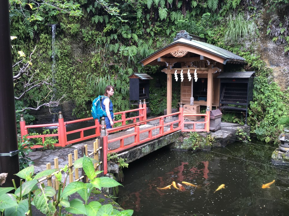 Na een tijdje klimmen en dalen door het bos bereiken we de Kuzuharaoka Jinja shrine, een mooie plek die heel veel rust uitstraalt. De schildpadden liggen te zonnen in een vijvertje en er worden etherische klanken afgespeeld op de achtergrond.