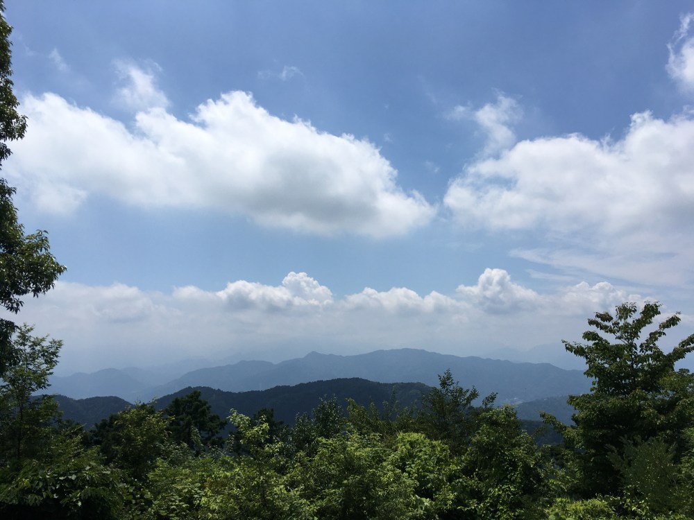 Eenmaal aan de top is het weer drukker en warm. We kijken even naar het mooie uitzicht, maar Mount Fuji zien we helaas niet want die bevindt zich achter de wolken.