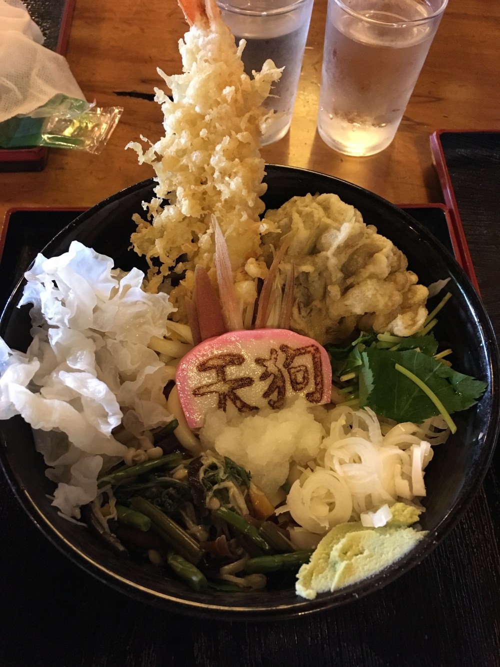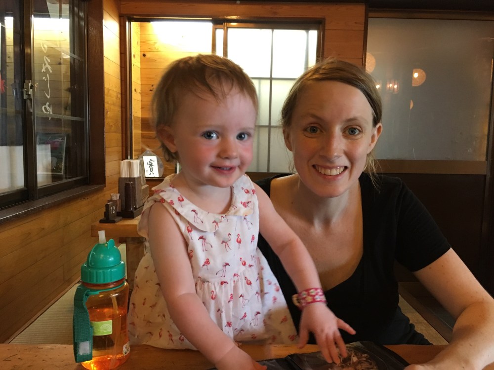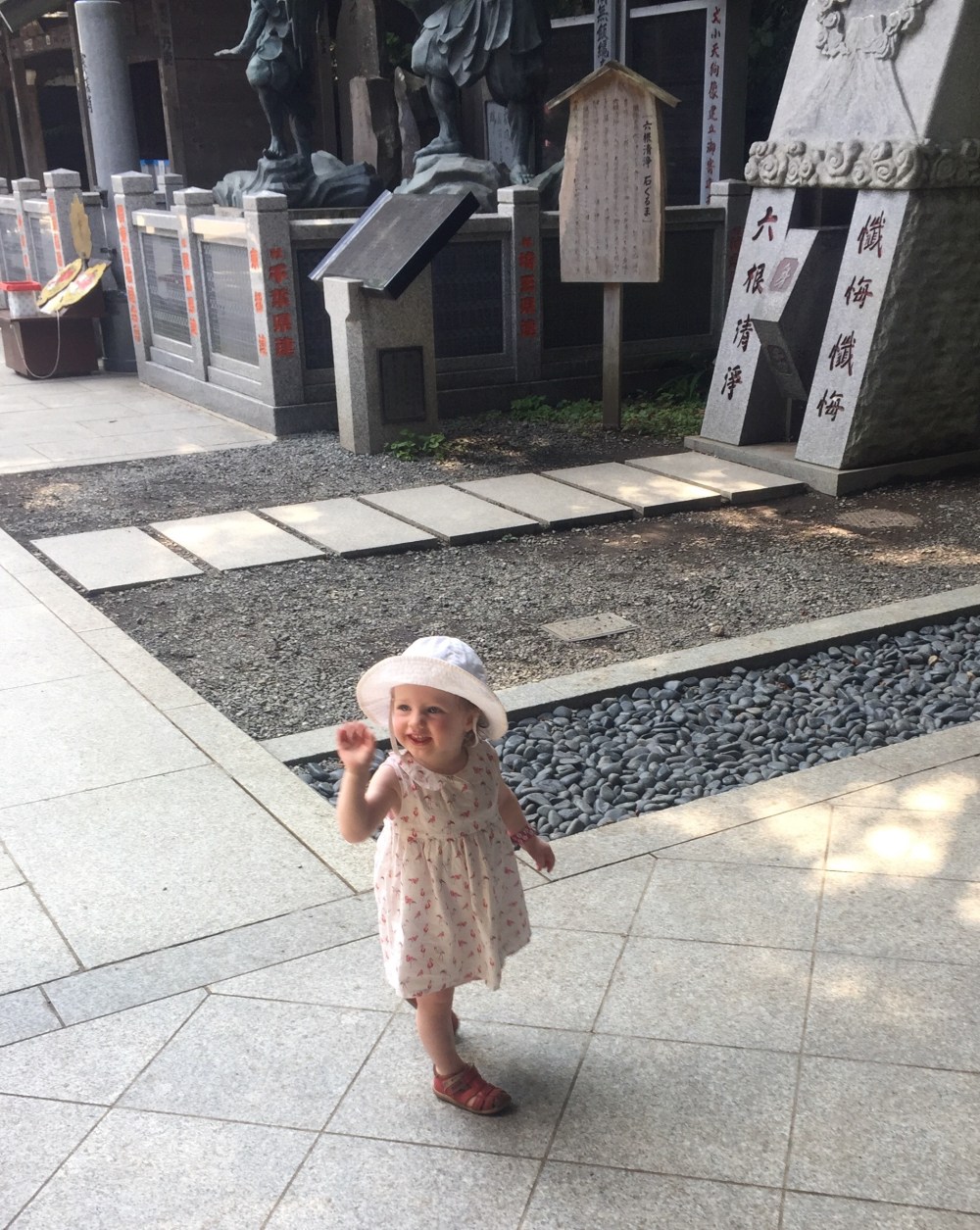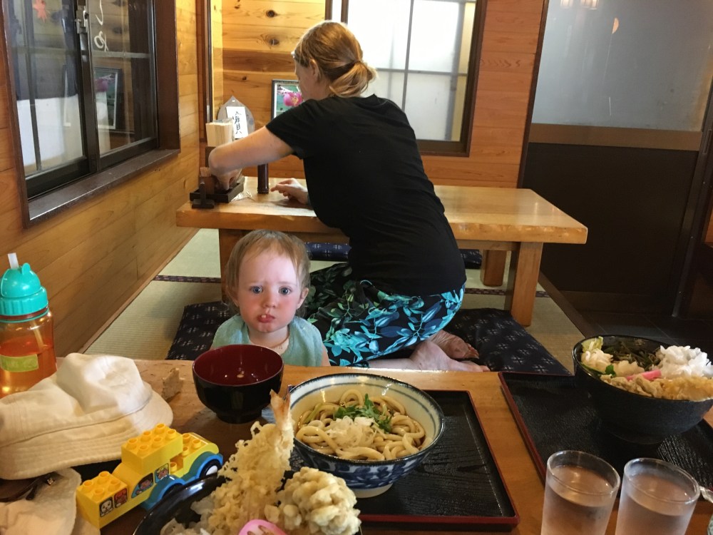 Op de terugweg nemen we de hoofdweg (route 1), en passeren we via de Yakuoin tempel. Daar eten we snel een noedelsoep, het is tenslotte al 14u. We zetten ons -bij gebrek aan een babystoel- aan een tafel op de tatamimatten, maar Alice vindt het veel te leuk om de andere tafel op de mat te bestuderen en slaagt er in om een potje met tandenstokers omver te gooien nét wanneer ons eten wordt gebracht. Resultaat: ik die één voor één de tandenstokers met de juiste kant terug in het potje probeer te krijgen terwijl Ulrike Alice in toom tracht te houden met noedels van aan de andere kant van de tafel, dit alles terwijl het personeel staat toe te kijken (we zijn nog de enige gasten). Zo één van die momenten die je niet gauw zal vergeten… Gelukkig is de noedelsoep wel erg lekker!