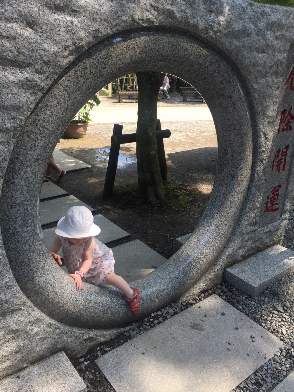 Na de snelle lunch bezoeken we nog even de tempel. Het is een heel “interactieve” tempel: je kan er aan een stenen rad draaien, door een stenen cirkel stappen, muziek opzetten door je hand op een plaat te houden… best wel leuk voor kinderen. Alice leeft zich alvast uit en zwaait spontaan naar de grote standbeelden van de buddha-bewakers.