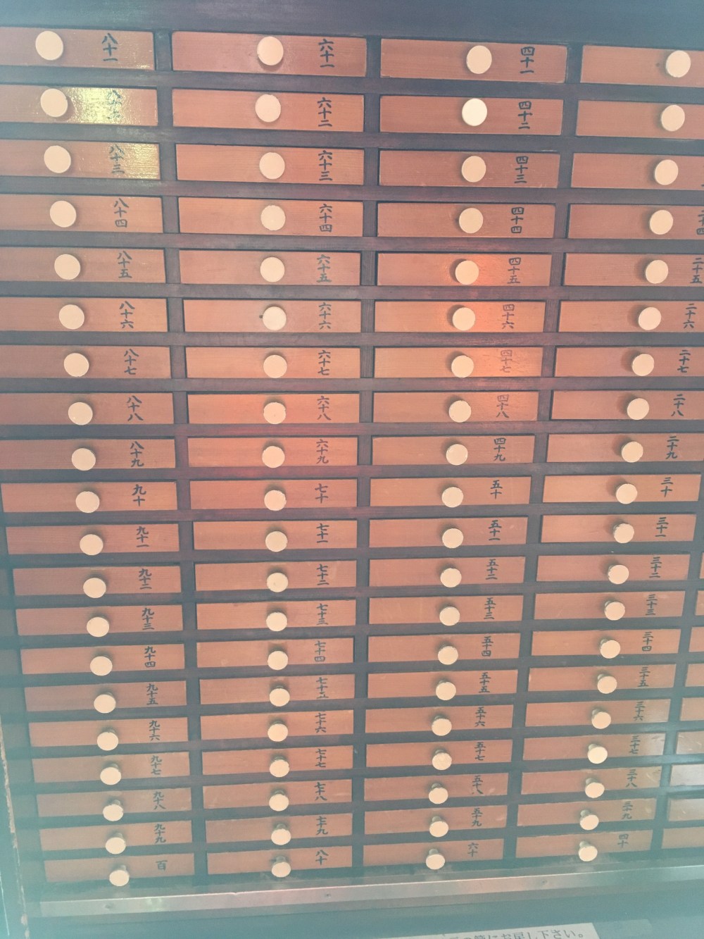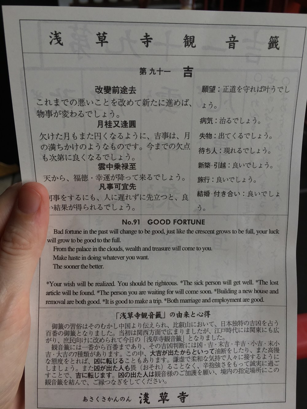 Binnen in de tempel doen we een wens door Alice te laten schudden met een metalen koker tot er een stokje uitvalt. Op het stokje staat een nummer in Japanse tekens. Met enige moeite zoeken we de overeenkomstige schuif en daaruit nemen we een blaadje met ons orakel. We hebben geluk en hebben een goed orakel getroffen, het blaadje kunnen we bijgevolg bijhouden en al onze wensen zullen uitkomen. Bij een slecht orakel moet je het blaadje aan een touwtje knopen.