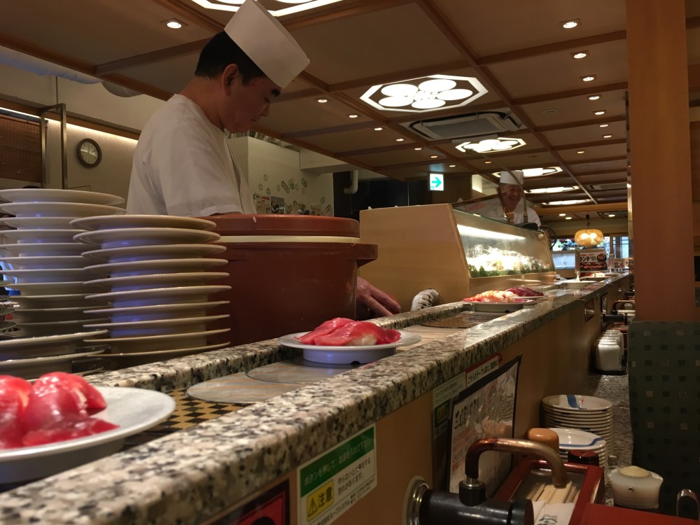 Na het bezoek aan de tempel wandelen we in de gezellige nabijgelegen straatjes. We houden halt voor een lunch in een sushi restaurant met een lopende band. We smullen van heerlijke sushi, vooral die met gegrilde tonijn is superlekker.