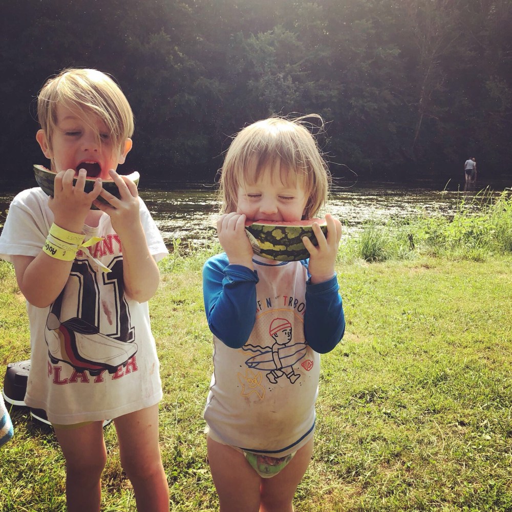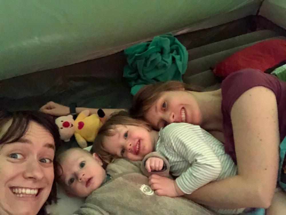 We hebben een supermooi plekje aan het water (zo goed als alle kampeerplaatsen hier liggen aan het water) en het is er zo stil en rustig op de camping dat we voor het eerst in ons leven de luidruchtigste gasten zijn. Wat wil je ook, met een baby van 6 maand, een peuter die volop in de peuterpubertijd zit en nog twee kerels van 4 en 6. Ze zijn allemaal zo opgewonden dat ze van hot naar her crossen en geen rekening houden met overige kampeerders. Oeps!