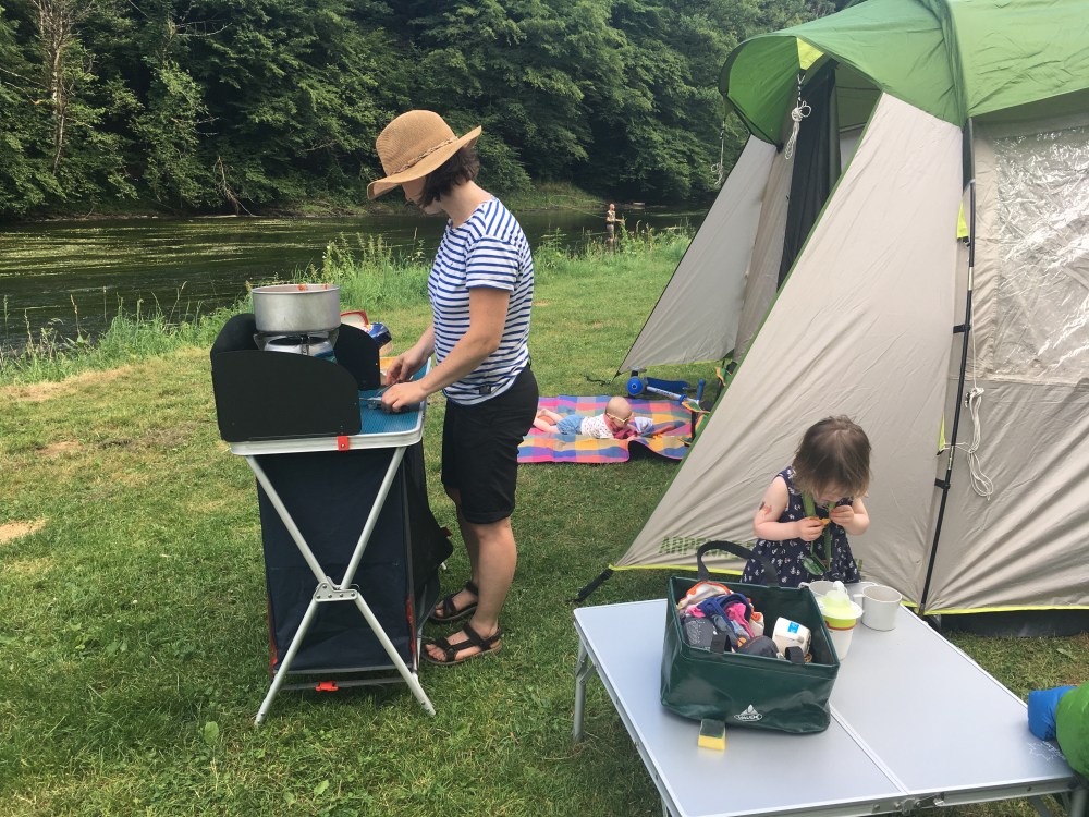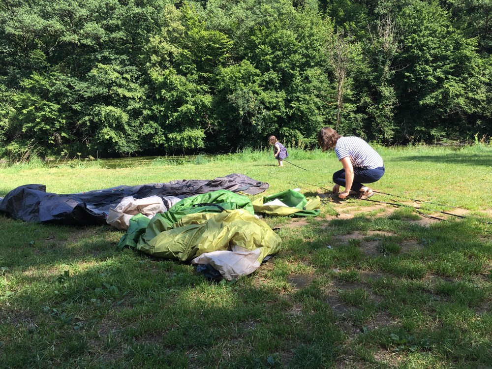 Na heel wat inpakstress (kamperen met twee kleine kindjes is precies een volksverhuis), komen we toe op de camping. De weersvoorspellingen zien er super uit en we starten vol enthousiasme met het opstellen van de tent. Of eerder: Ulrike doet alles en laat zich hierbij ‘assisteren’ door Alice, terwijl ik borstvoeding geef aan Jeanne.