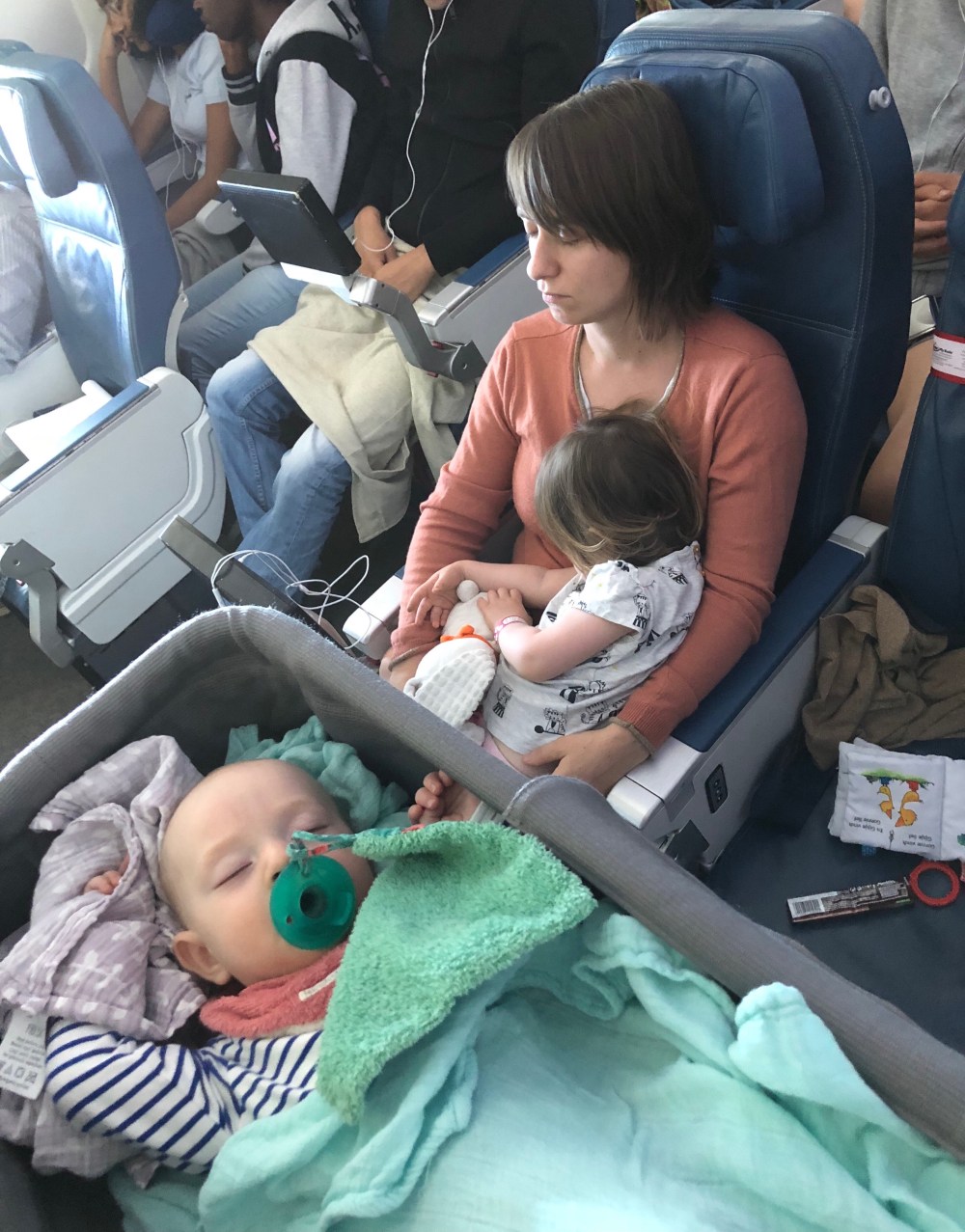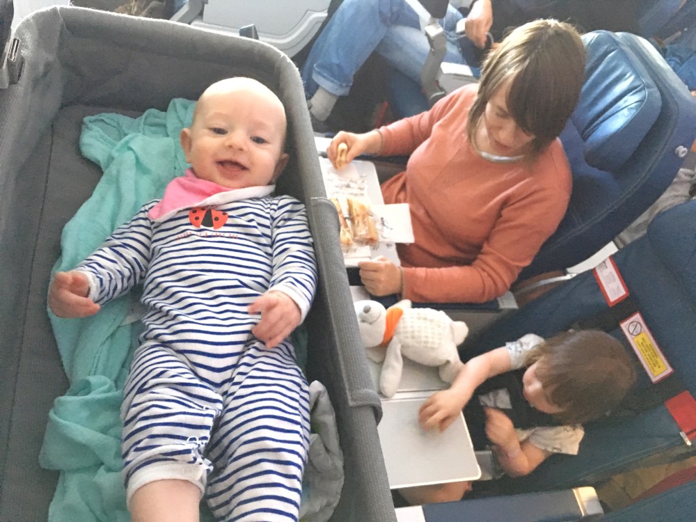 De uren die volgen houden we Alice bezig met al het speelgoed dat we mee hebben, een hoop snacks (kaas, komkommer, worstjes, …) en uiteraard ook het op en af wandelen van de smalle gangen. Jeanne zit ondertussen afwisselend op onze schoot en in de bassinet wat rond te kijken en te drinken. Na enkele uren worden beide kindjes moe en begint de strijd tegen de slaap. Jeanne valt al gauw in slaap aan de borst, maar Alice is té opgewonden om in slaap te geraken. Op zo’n momenten is een bed toch handig. Uiteindelijk valt ze in slaap na een stevige huilbui. Wanneer beide kindjes slapen, kijken elkaar aan en denken “dit valt tot nu toe goed mee!”.