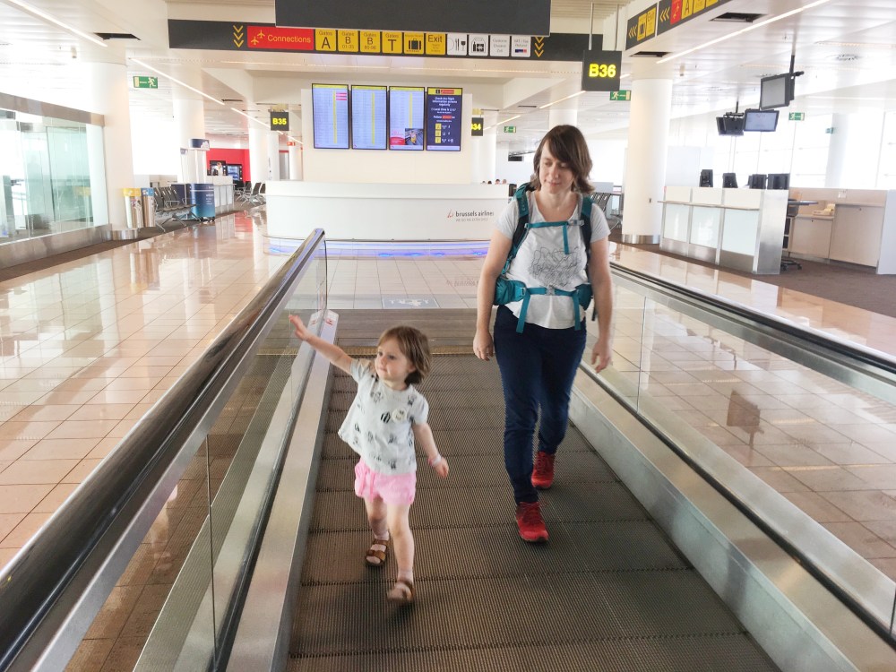 Na een vlotte check-in en doorgang door security, begeven we ons naar gate B40 om Alice nog even te laten uitrazen aan het mini-speeltuintje. Maar eigenlijk vindt ze de roltapijten en het uitkijkpunt op de landende vliegtuigen veel interessanter.