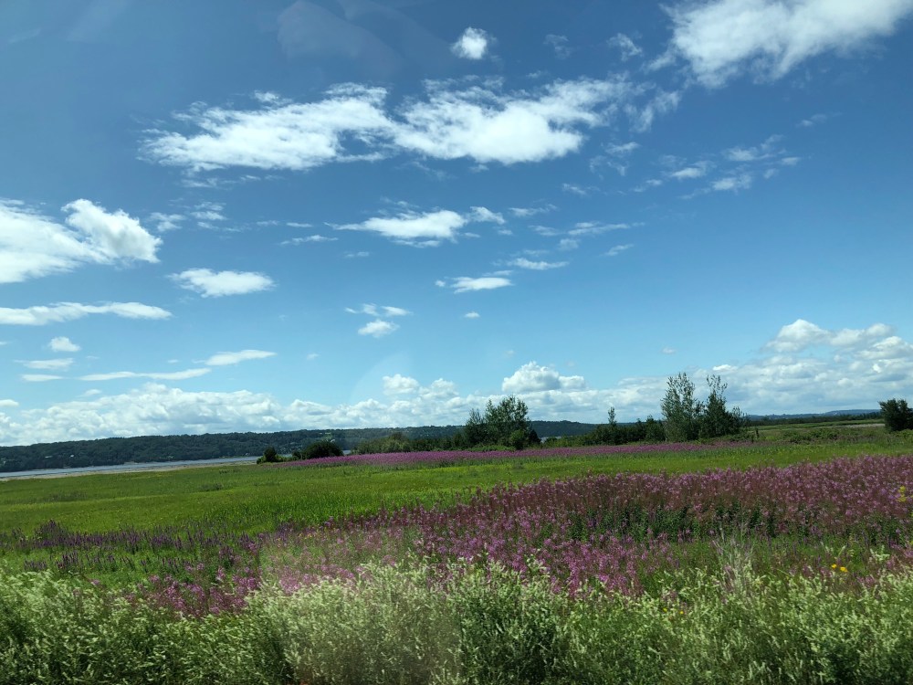 Onderweg kijken we onze ogen uit, de combinatie van de brede rivier, stralende hemel en de paarse bloemen maken dat we meteen de auto aan de kant zouden willen zetten om te wandelen in al dat moois.