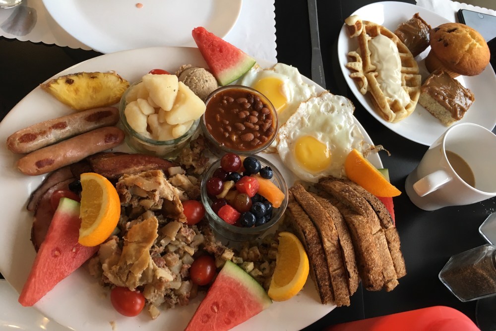 We zijn al bijna een week in Québec, en op de frietjes in de Zoo Sauvage na zijn we nog geen enkele keer uit eten gegaan. Tijd om daar verandering in te brengen! We gaan ontbijten in een diner vlakbij, Chez Bin. We eten er met z’n vieren van de “brunch pour deux”: muffin, wafel, dulce de leche, fruit, spek, spiegelei, patatjes, worst, bonen, brood, huisgemaakte confituur, rillette, … gigantisch veel!