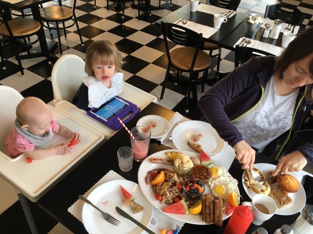 We staan ervan versteld hoe rustig de kindjes zich houden: Jeanne eet ganse stukjes watermeloen uit het vuistje en Alice drinkt een gigantische aardbeismoothie leeg en eet mee van onze schotel.