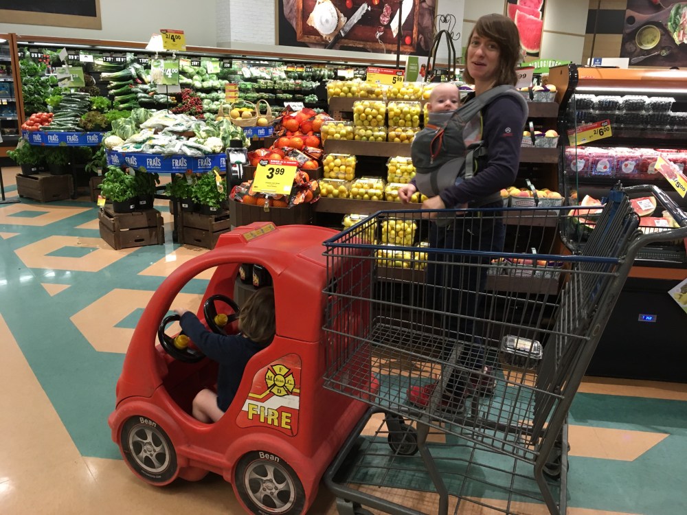 Nadien doen we nog een stop in de supermarkt voor nog wat eten voor de komende dagen. De IGA-supermarkt is hier groot en heeft veel verse etenswaren. Maar het leukste aan de supermarkt vinden we de winkelkar waar een speelauto voor hangt. Je kan er zowaar twee kindjes in laten zitten én nog eens twee op de stoeltjes van de kar zélf. Met vier kinderen gaan shoppen lijkt zo wel kinderspel.