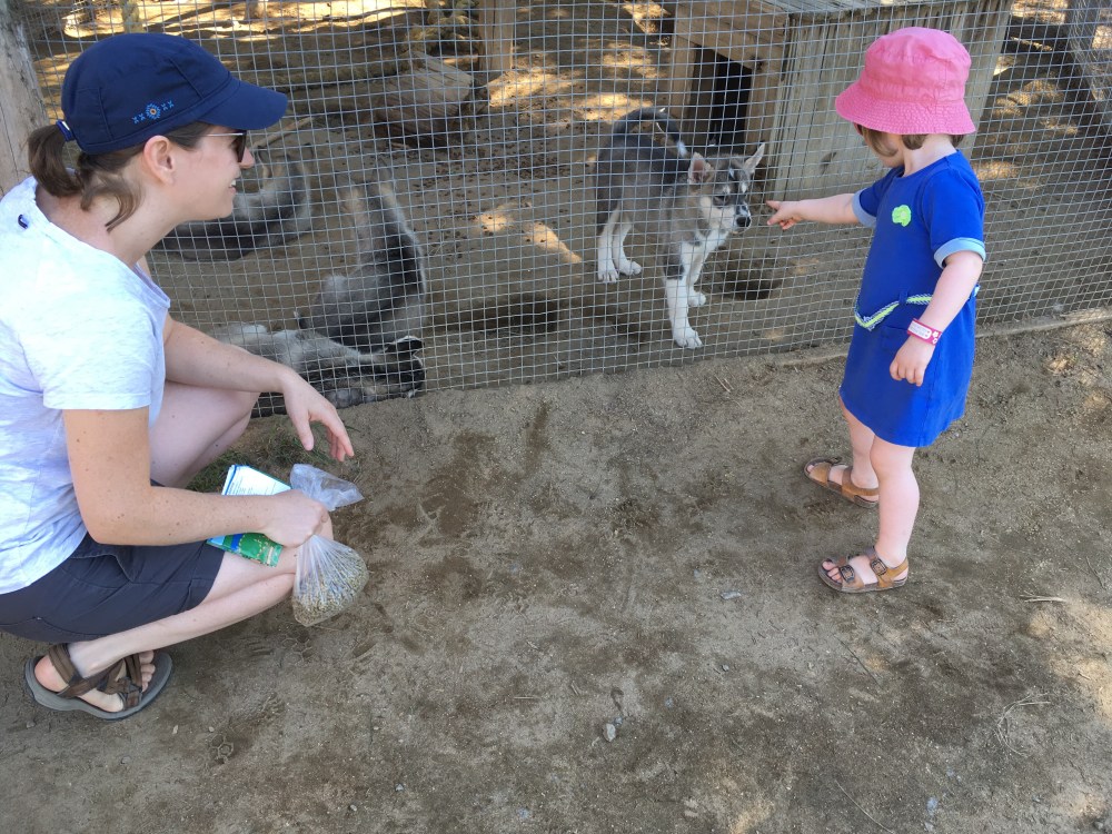 Daarna wandelen we een dikke kilometer naar de slee-honden en dan bewonderen we nog de pasgeboren puppy’s, de hertjes en alle andere dieren op de boerderij.