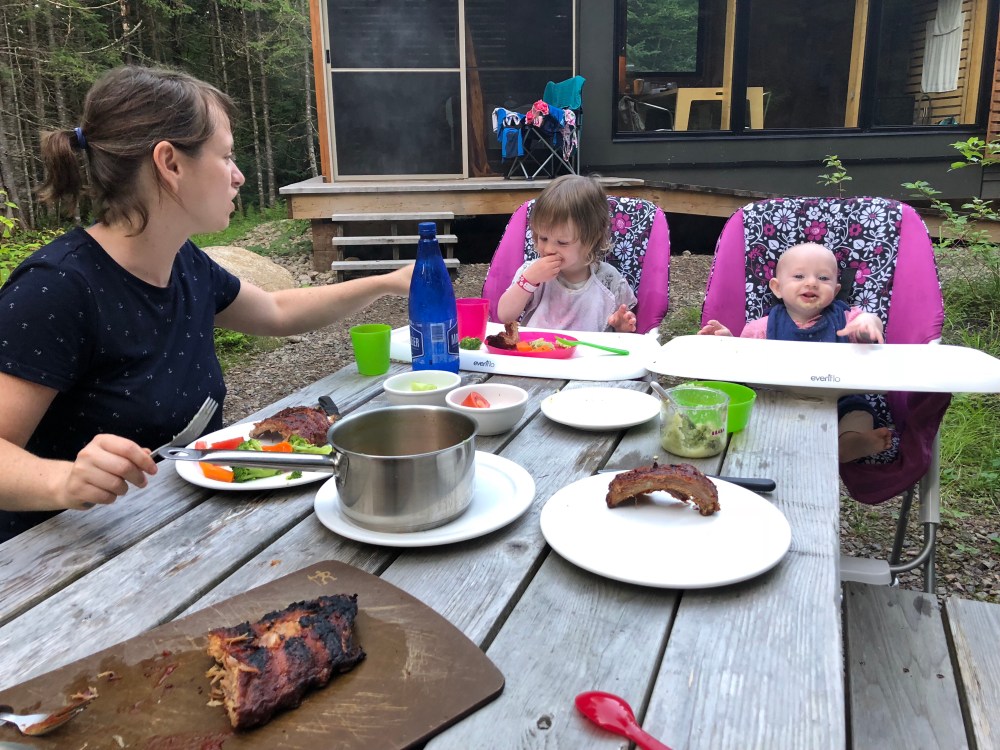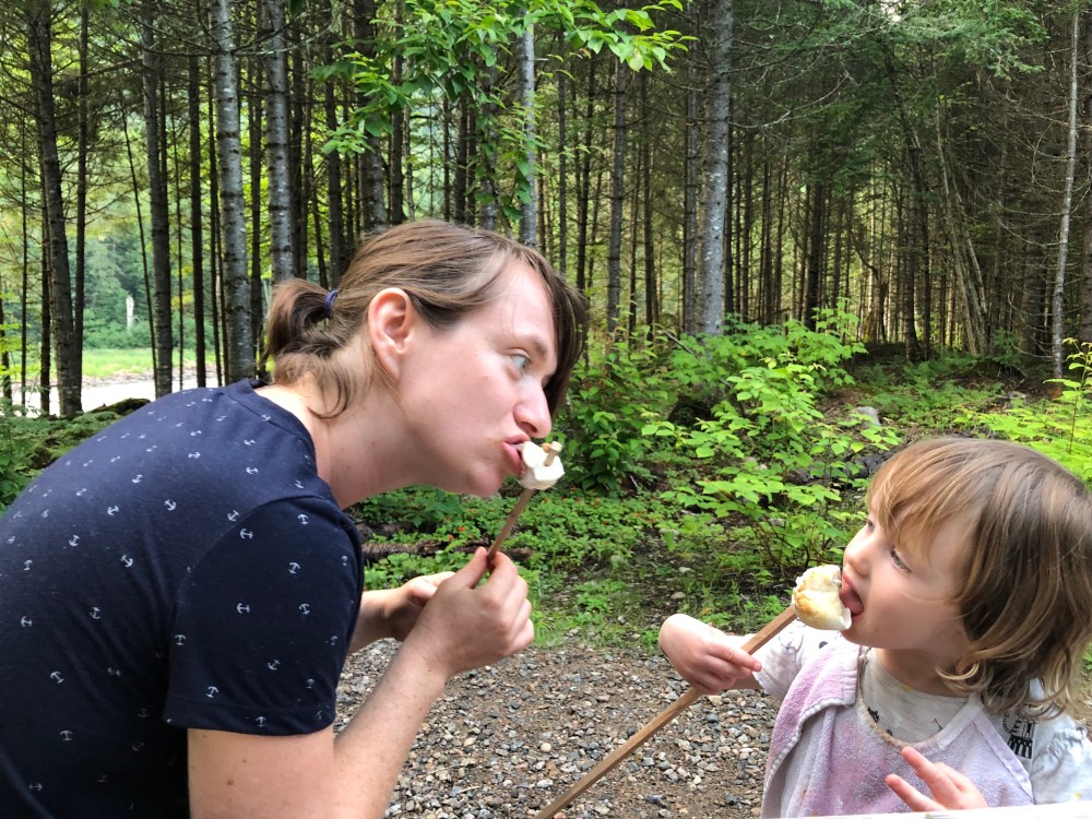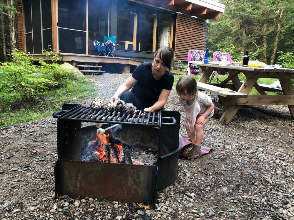 Bij thuiskomst steekt Ulrike het kampvuur aan om er de ribbetjes en patatten op te bakken. We eten met z’n allen gezellig buiten en Alice eet voor het eerst geroosterde marshmallows.