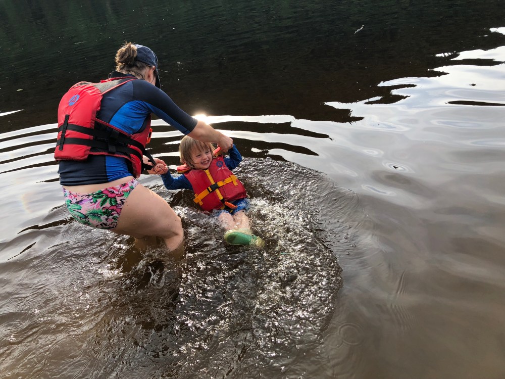 Eenmaal terug in de natuur huren we een opblaasbare kano (want die zijn stabieler dan een gewone kano) om ermee op het rustige deel van de rivier te varen. Het weer is helemaal opgeklaard, dus dit is het ideale moment hiervoor. Alice is helemaal opgewonden maar na een kwartiertje heeft ze het gehad en wil ze zwemmen. Zo gezegd, zo gedaan, en dus zwemmen we nog een tijdlang in het frisse water van de rivier.