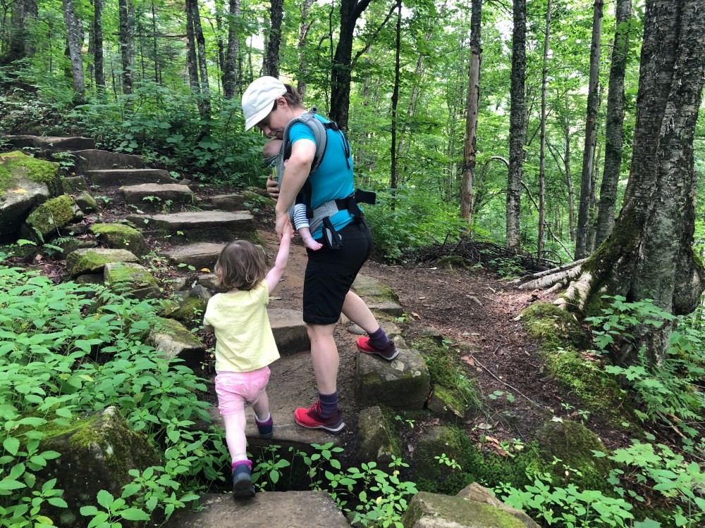 Na 600m is Alice moe-geklauterd en hijsen we ze in de draagrugzak. Met 13 kg op de rug, stijgen we verder door het bos. De wandeling op zich is eigenlijk niet moeilijk, maar de beweeglijke Alice op de rug maakt het wel zwaar. Binnen de kortste keren ben ik nat in’t zweet.