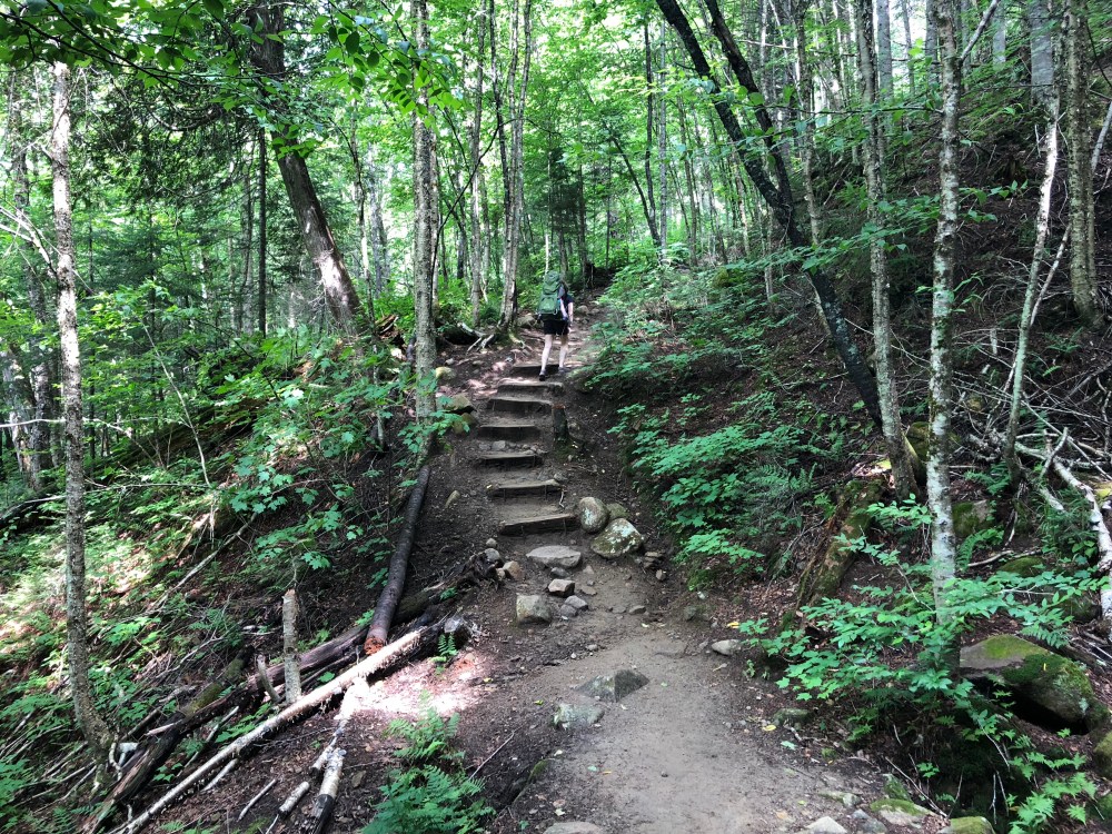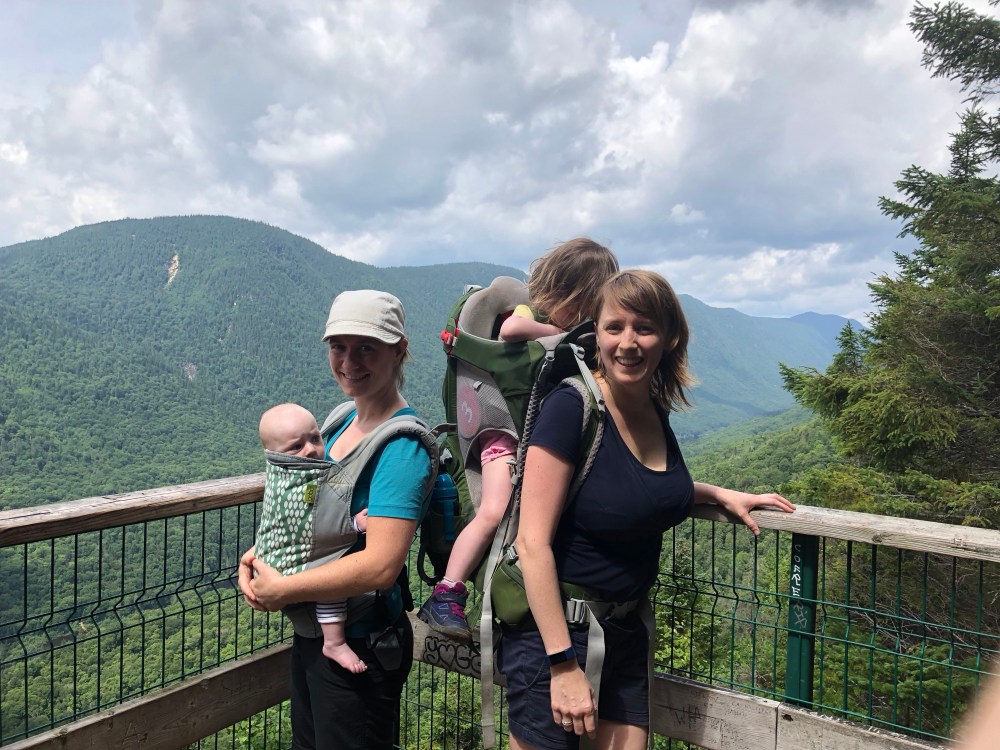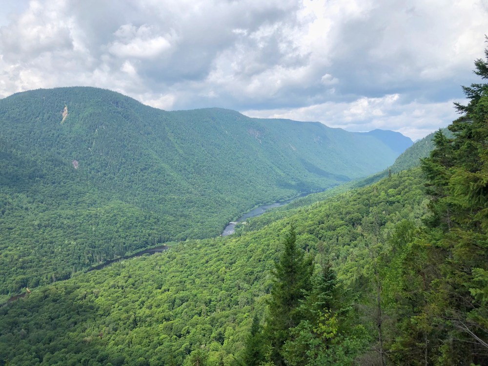 Na een klein anderhalf uur klimmen, zijn we aan het eerste uitkijkpunt. Van hieruit hebben we een spectaculair uitzicht op de afgeronde bergen, gevormd door de Jacques Cartier rivier.