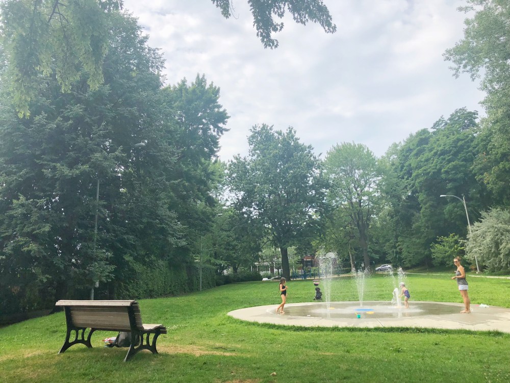 We beginnen dus met een uitstapje naar de speeltuin. We gaan eerst naar Westmount park, maar omdat het zo warm is gaan we al gauw op zoek naar de speeltuin om de hoek van het appartement waar er speelfonteinen zouden zijn. Onderweg passeren we de ene na de andere riante villa.