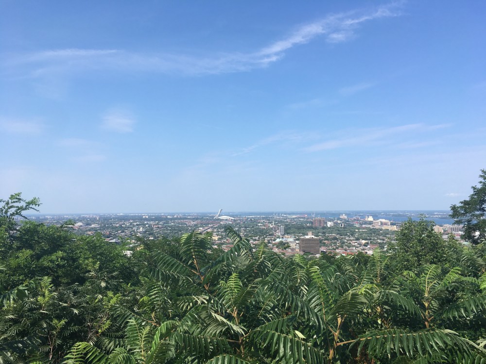 Het is al voorbij 15u wanneer we dan eindelijk klaar zijn om Montreal te verkennen. Eerste stop: de Belvédère Camillien-Houde in het Mont Royal park dat, zoals de naam het doet vermoeden, op een berg gelegen is en dus een goed uitzicht over de stad geeft. Het is snikheet dus hebben we de moed niet om door te stappen naar de Chalet du Mont Royal, waar het uitzicht nog beter zou zijn.
