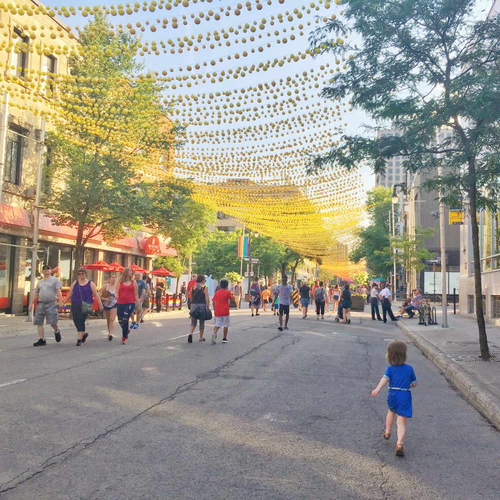 Vervolgens nemen we de auto tot “le Village”, de homobuurt in het centrum van de stad. Daar is namelijk een straat, de Rue Sainte-Catherine, die volledig overdekt is met slingers van ballen in alle kleuren van de regenboog en die voor een groot deel autovrij is, ideaal dus met kinderen. Op voorhand deed de straat ons vooral denken aan het gelijknamig liedje, maar nu zal ik me de straat altijd herinneren als de plek waar onze peuter languit op het asfalt ging liggen tijdens een tantrum, terwijl de hipster homo-mannen vanop de terrassen aan het staren waren 🙂