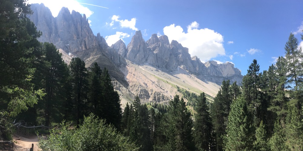 Vanuit de parking wandelen we door het bos over een breed pad dat langzaamaan stijgt. Aan een splitsing (met de naam Tschantschenon) gaan we rechtsaf en komen we terecht op de Adolf-Munkelweg (route 35) dat ons aan de voet van de steile noordwanden van de Geisler pieken brengt.